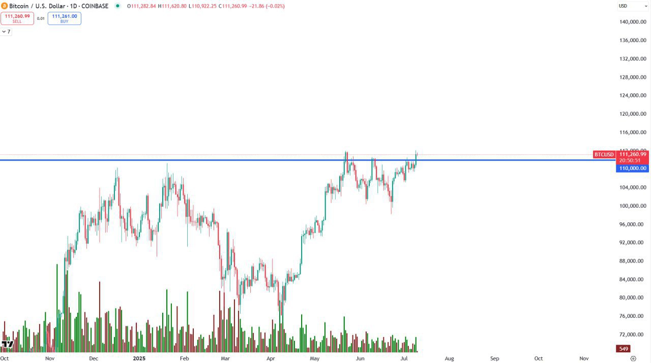 This image shows a price chart of Bitcoin (BTC) against the U.S. Dollar approaching a key horizontal resistance level at $110,000.