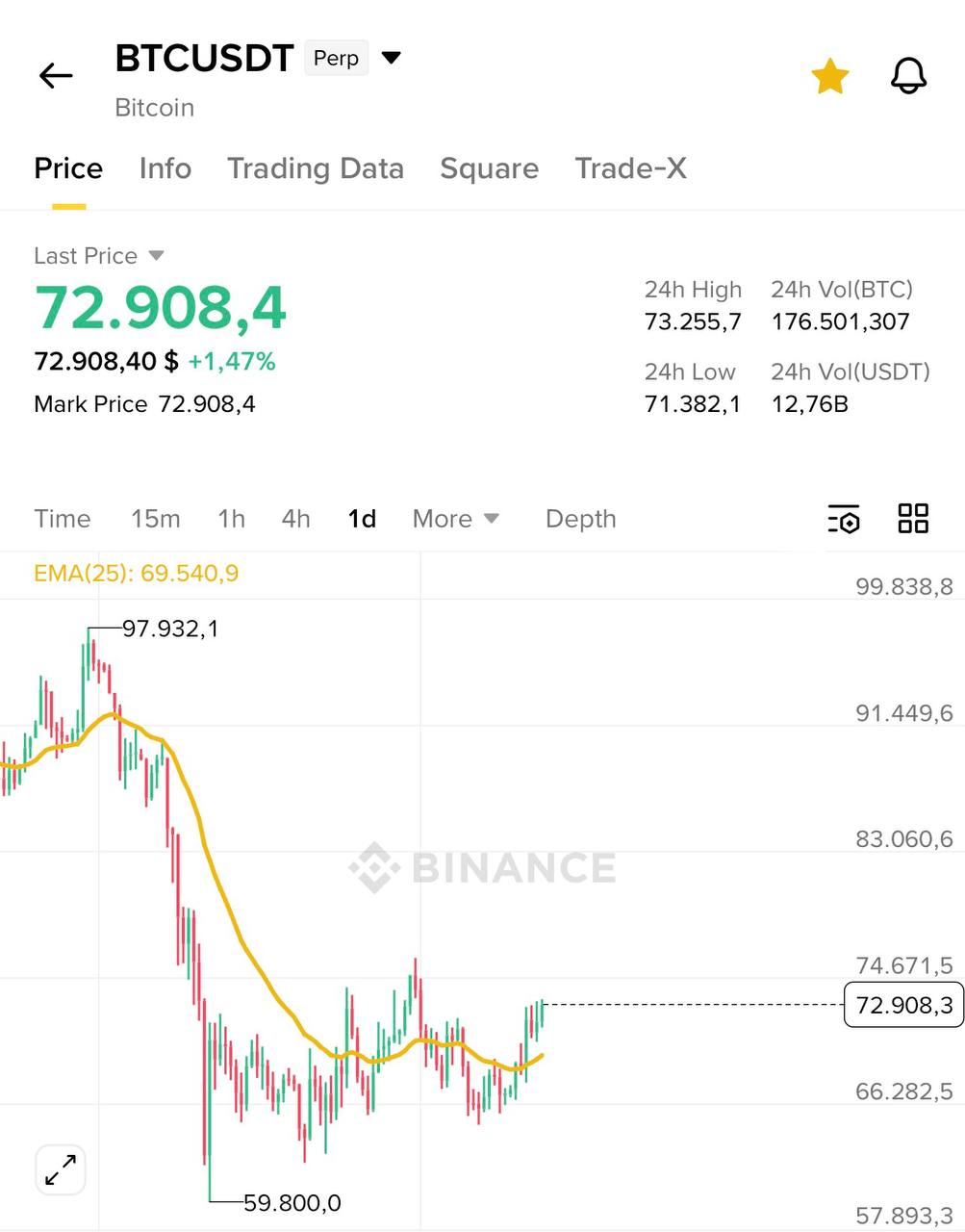 Bitcoin price snapshot chart showing last price, 24-hour high and low, EMA values and recent price movements. No additional text provided in the original post.