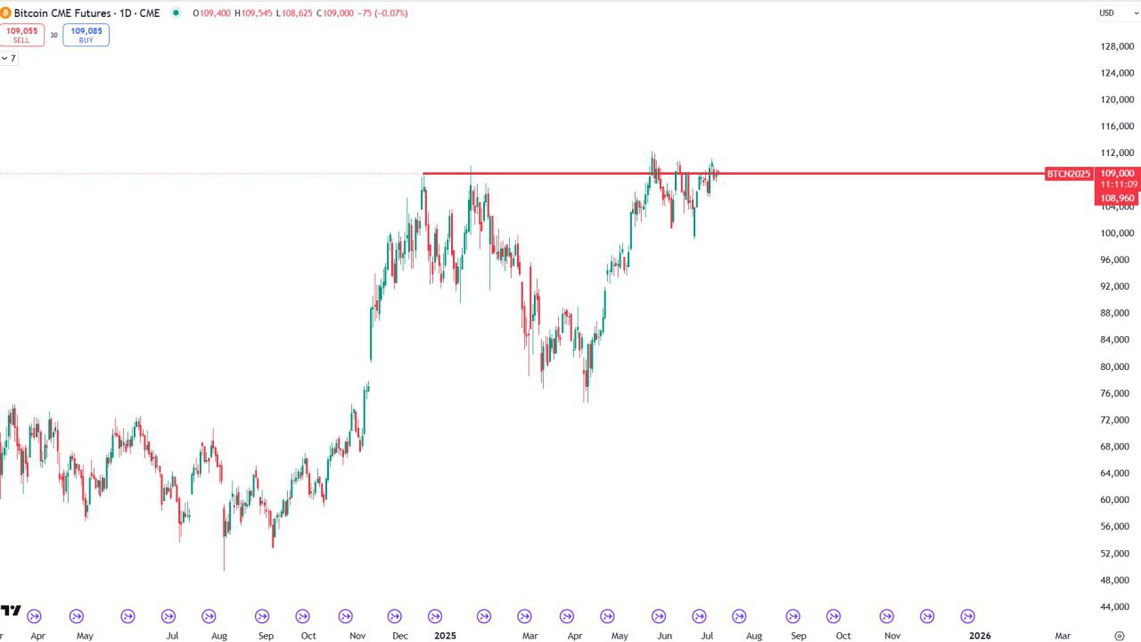 This image shows the Bitcoin CME Futures chart with price approaching a horizontal resistance level. No clear long or short signal setup is presented.