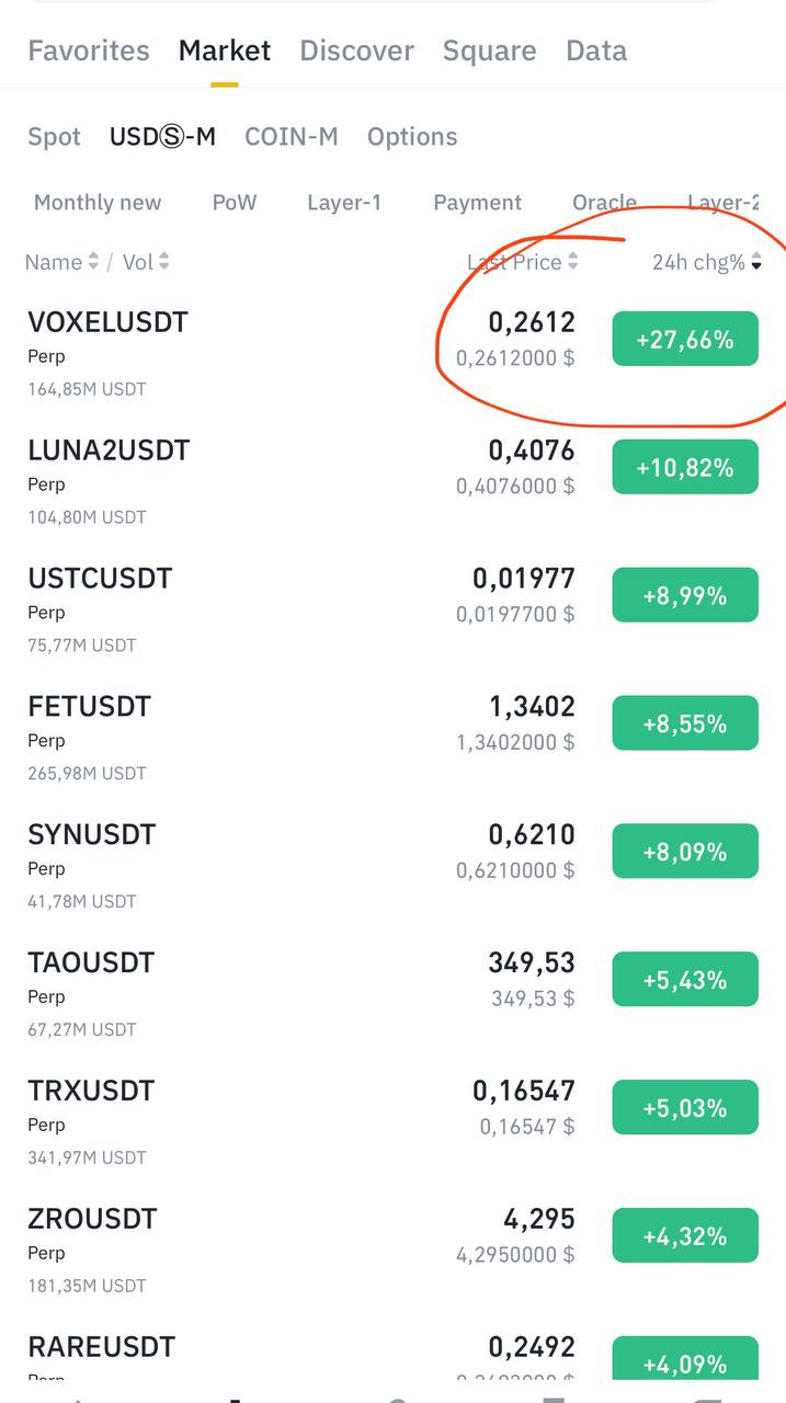 This image shows the market prices and percentage changes of various cryptocurrencies, with VOXELUSDT highlighted. π£ If you like my project and wish to support me, the best support would be to subscribe to the private channel. π ______ π…