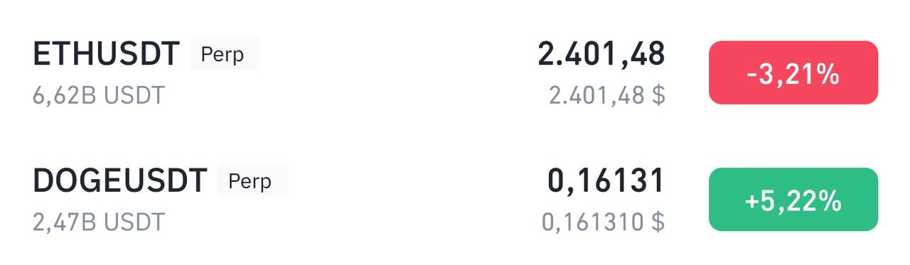 The current market data displays ETHUSDT and DOGEUSDT with their respective prices and trends.