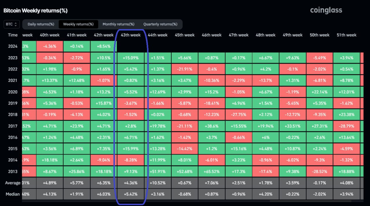 The data for the 43rd week shows a median return of +5.42% for Bitcoin.