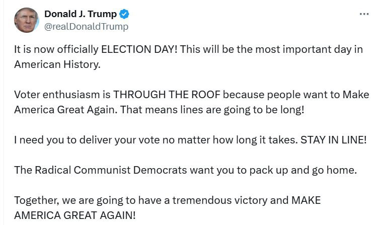 The tweet discusses the importance of election day and voter enthusiasm but does not relate to cryptocurrency trading.