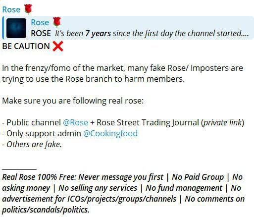 The message warns about fake accounts and emphasizes caution in the cryptocurrency market.