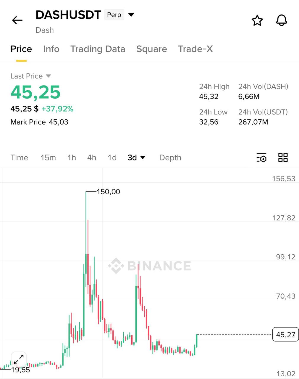 The first image shows the price movement and performance of Dash (DASH) with a notable recent increase.