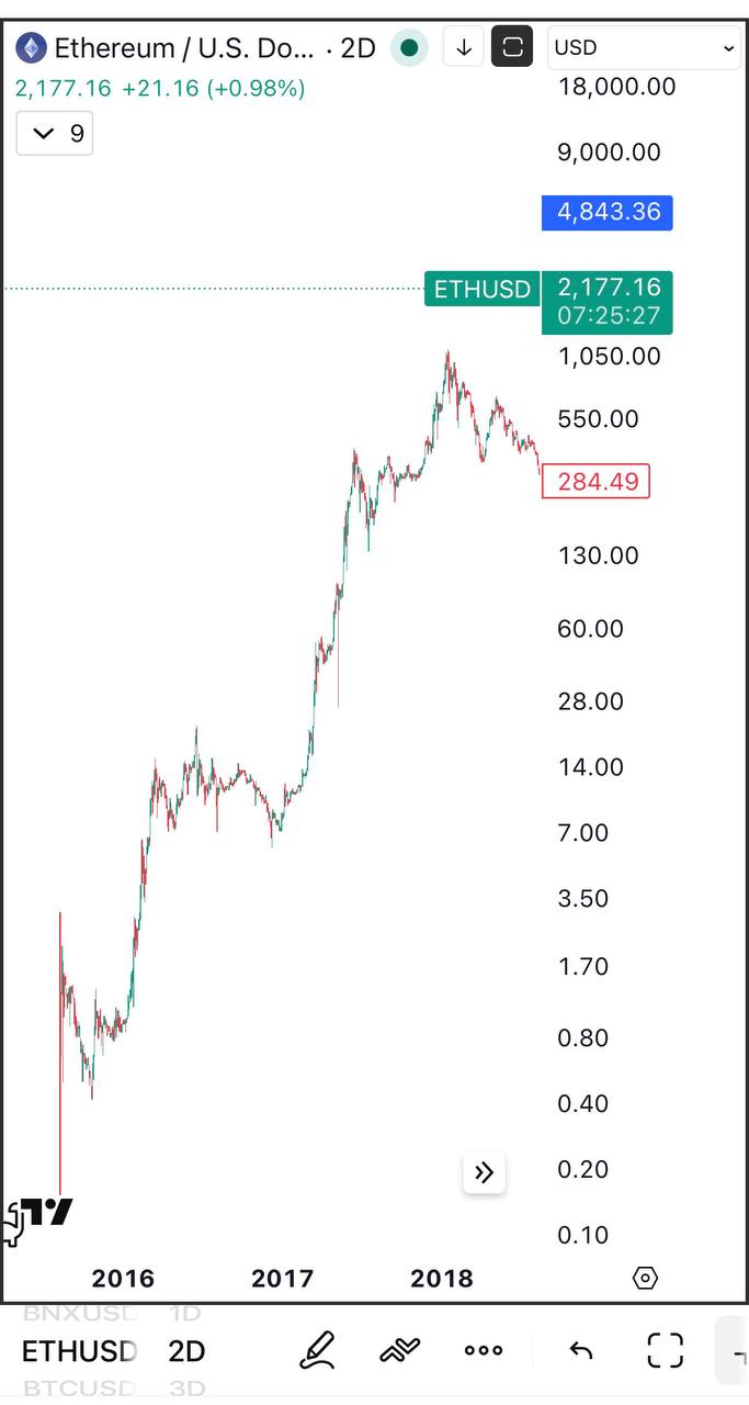 This image displays the historical price chart of Ethereum against the U.S. Dollar, showing price movements over several years.