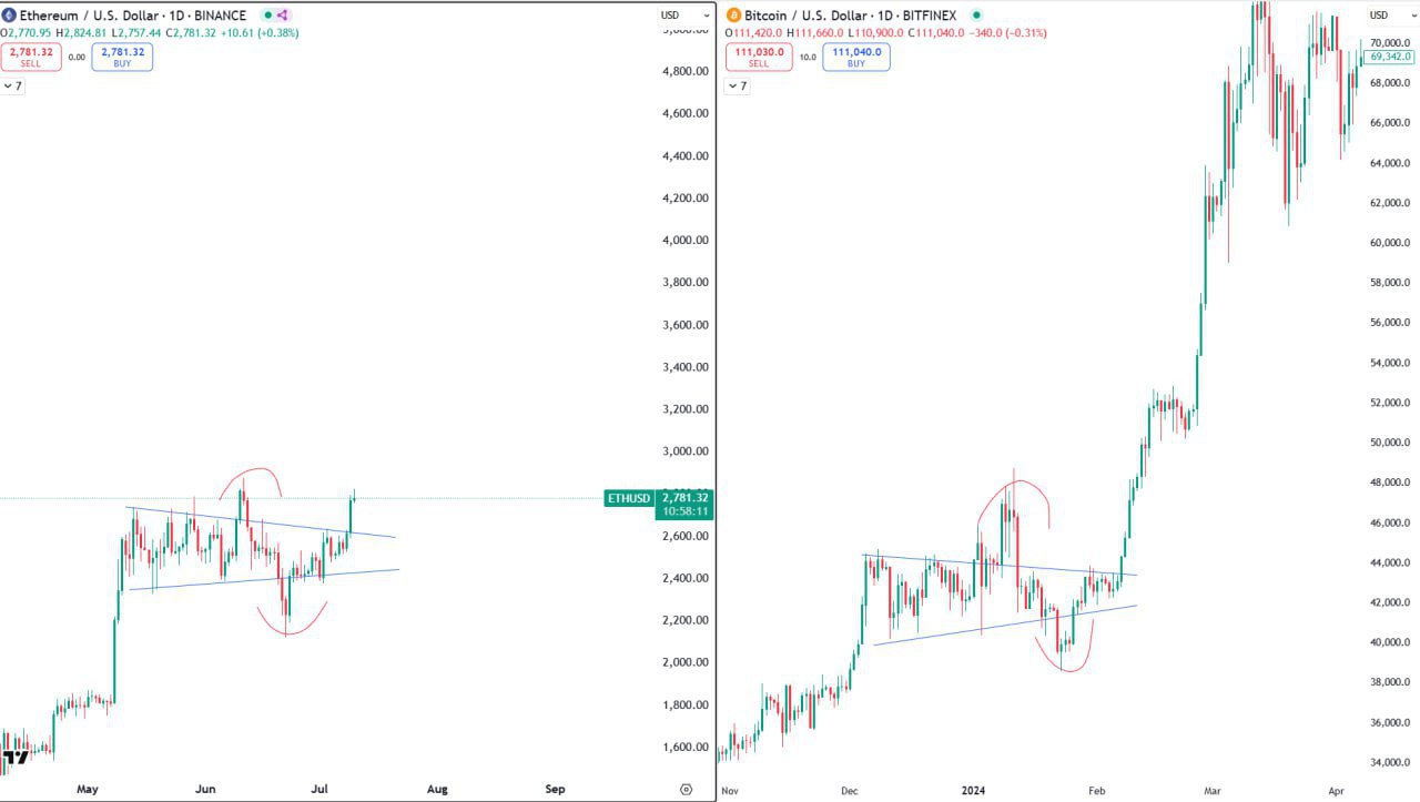 This image is a comparison between Ethereum and Bitcoin price patterns, showcasing similar breakout formations in both charts.