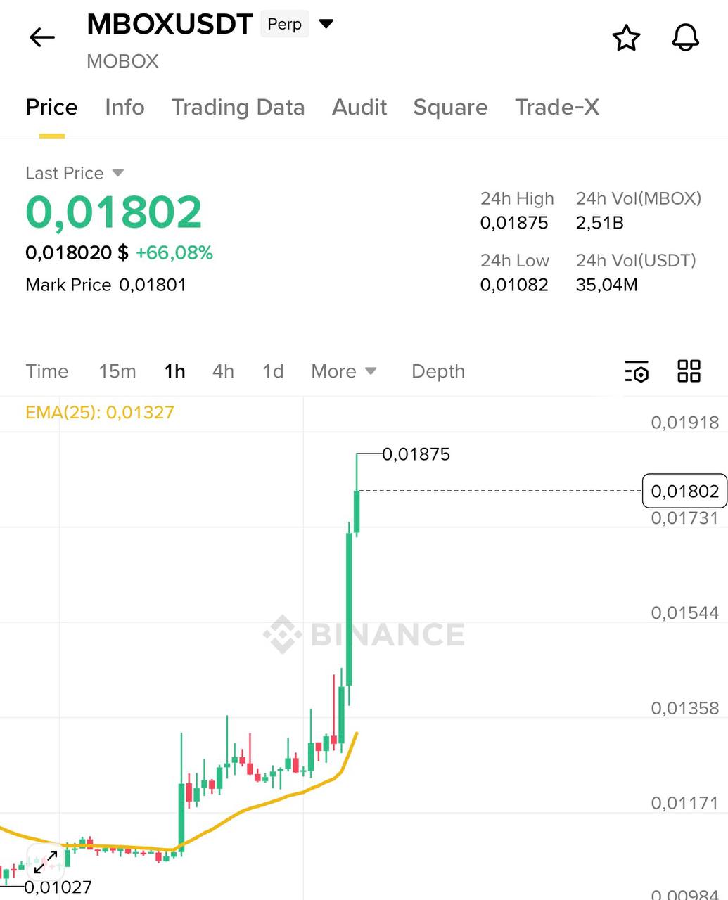 This image displays a bullish setup for the MBOX cryptocurrency, indicating potential upward movement with a significant price increase shown.