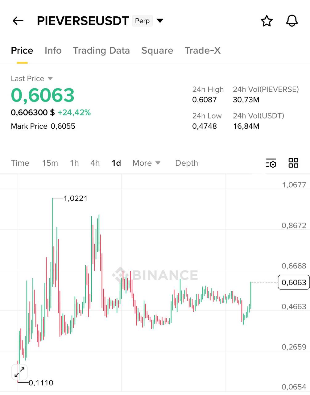 The image displays a detailed price chart for the cryptocurrency PIEVERSEUSDT, along with its last price, 24-hour high/low, and trading volume.