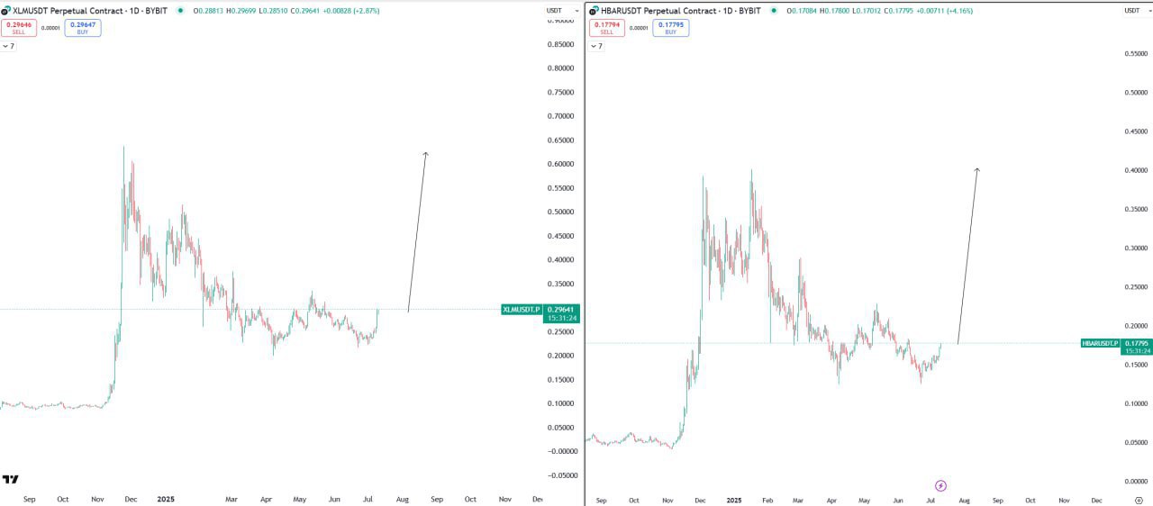 This image shows a price setup suggestion for XLM and HBAR, likely indicating potential long opportunities based on visual chart projections.