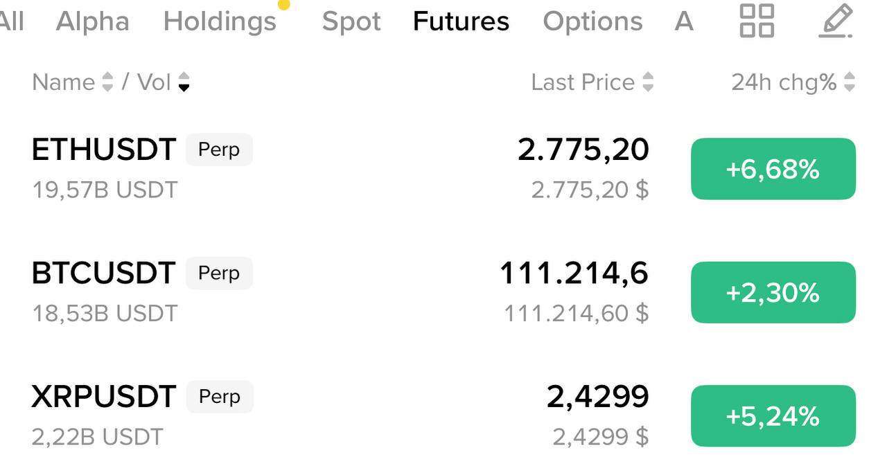 This image shows a snapshot of cryptocurrency futures pairs (ETHUSDT, BTCUSDT, XRPUSDT) with their last prices and 24-hour percentage changes.