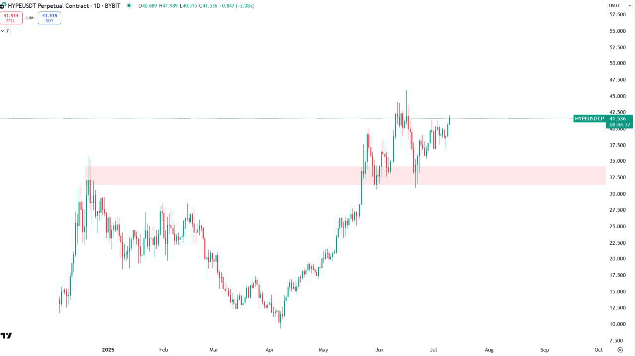 This image shows the price action of the HYPE/USDT perpetual contract, indicating a potential breakout from a consolidation phase.