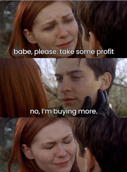 The image depicts a humorous meme related to cryptocurrency trading, illustrating a conversation about taking profits versus buying more.