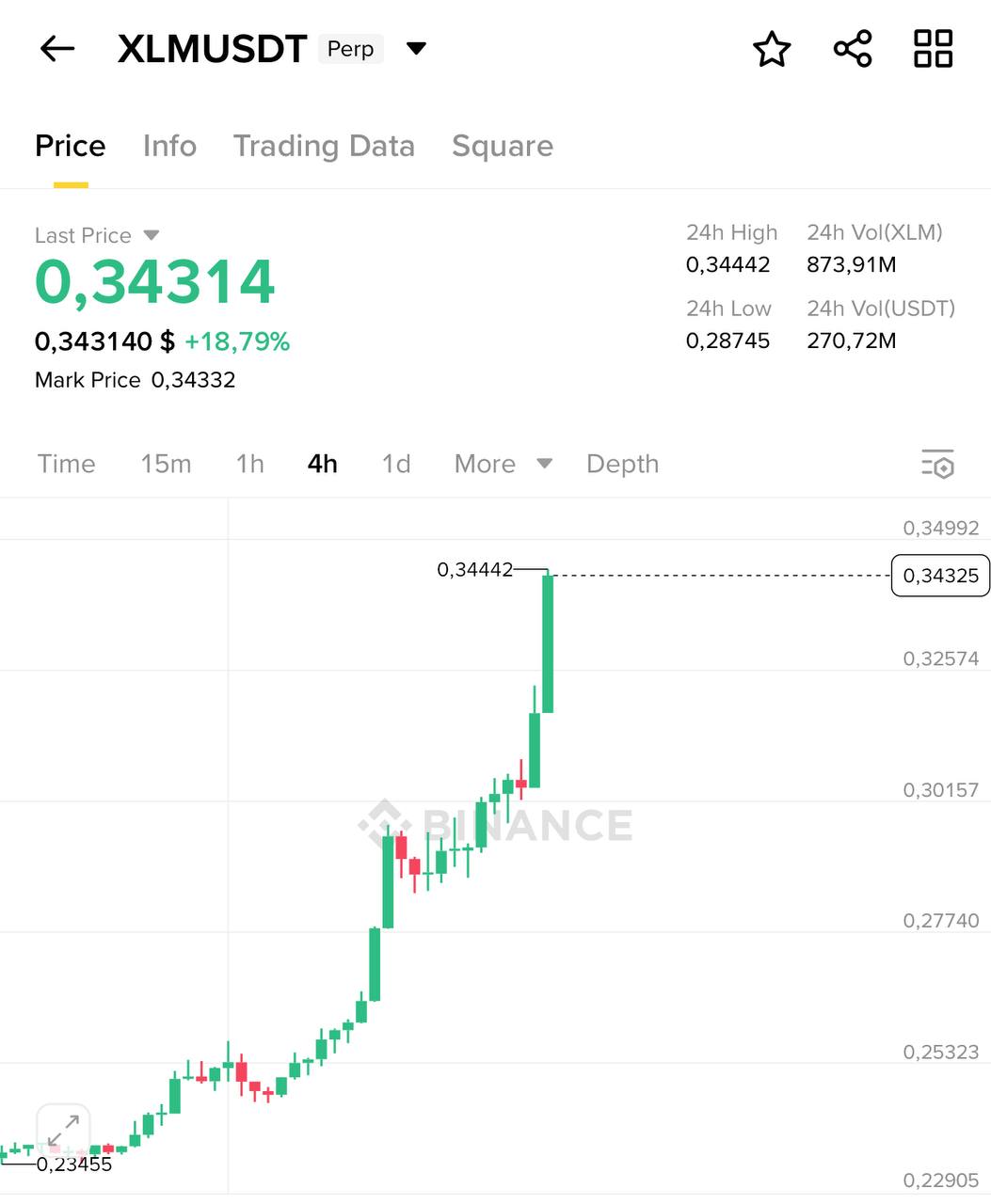 This image shows a strong price breakout for XLM/USDT on the 4-hour chart, with a sharp upward movement and a nearly 19% gain.