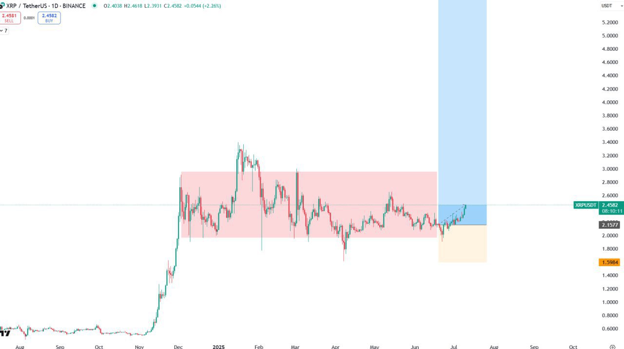 This image shows a potential long setup for XRP based on technical analysis, likely targeting a breakout from a consolidation range.