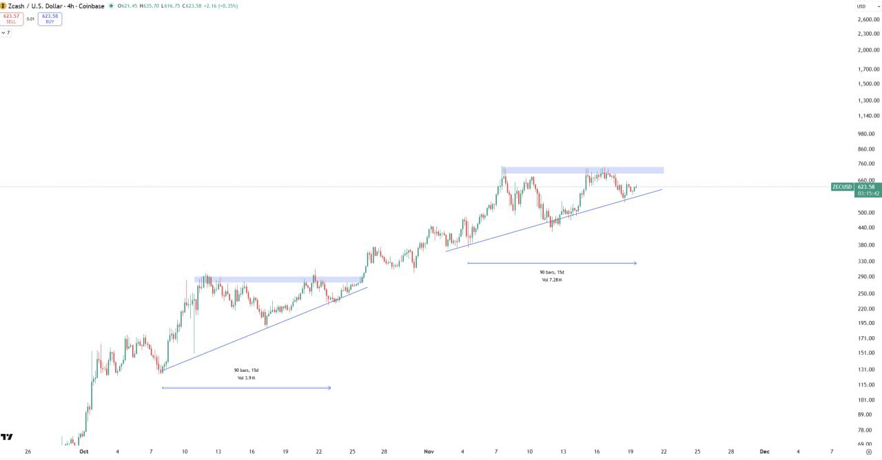 The image provides a trading analysis for Zcash (ZEC) against the U.S. Dollar. It depicts a chart with a noticeable trendline and potential resistance levels marked.